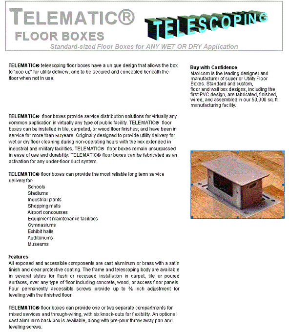 Please contact Maxicom for additional information, Requests for Proposals/Information and technical assistance. Maxicom 1100 W. Indiana Avenue Philadelphia, PA 19133 Tel. 215-225-2200 Fax 215-225-2222 info@floorbox.com www.floorbox.com
